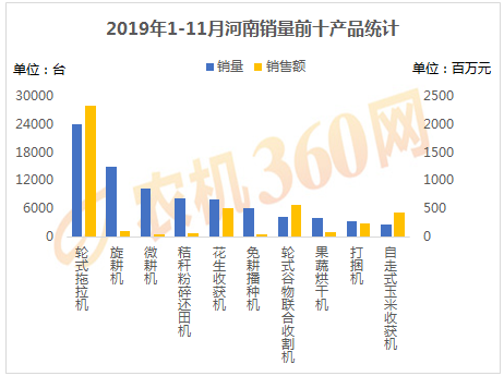 2019年1-11月,上榜河南用戶購機(jī)量前十的農(nóng)機(jī)產(chǎn)品如下圖所示,輪式拖拉機(jī)、旋耕機(jī)、微耕機(jī)等10種農(nóng)機(jī)合計(jì)購買力接近8.5萬臺,占了河南農(nóng)機(jī)總銷量的約80%,對這10類農(nóng)機(jī)的購機(jī)支出達(dá)43.3億元。
