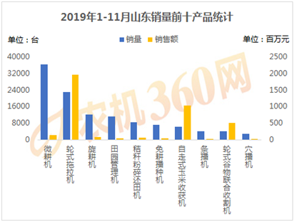 2019年1-11月,上榜山東用戶購機(jī)量前十的農(nóng)機(jī)產(chǎn)品如下圖所示,微耕機(jī)、輪式拖拉機(jī)、旋耕機(jī)等10種農(nóng)機(jī)合計(jì)購買力11.5萬多臺,是山東農(nóng)機(jī)總銷量的86.54%,對這10類農(nóng)機(jī)的購機(jī)支出達(dá)38.55億元。