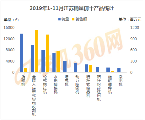 2019年1-11月,上榜江蘇用戶購機(jī)量前十的農(nóng)機(jī)產(chǎn)品如下圖所示,旋耕機(jī)、全喂入履帶式谷物收、輪式拖拉機(jī)等10種農(nóng)機(jī)合計(jì)購買力5.45萬臺,是江蘇農(nóng)機(jī)銷量的85.35%,對這10類農(nóng)機(jī)的購機(jī)支出達(dá)31.02億元。