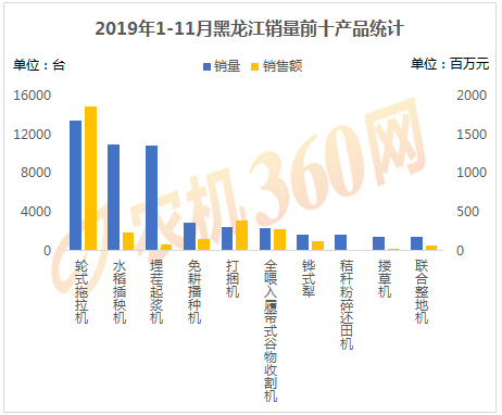 2019年1-11月,上榜黑龍江用戶購機(jī)量前十的農(nóng)機(jī)產(chǎn)品如下圖所示,輪式拖拉機(jī)、水稻插秧機(jī)、埋茬起漿機(jī)等10種農(nóng)機(jī)合計(jì)購買力4.9萬臺,是黑龍江農(nóng)機(jī)銷量的93.09%,對這10類農(nóng)機(jī)的購機(jī)支出達(dá)32.23億元。